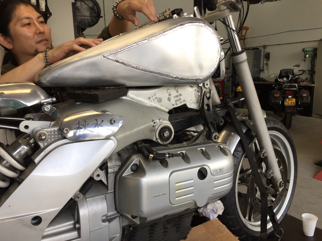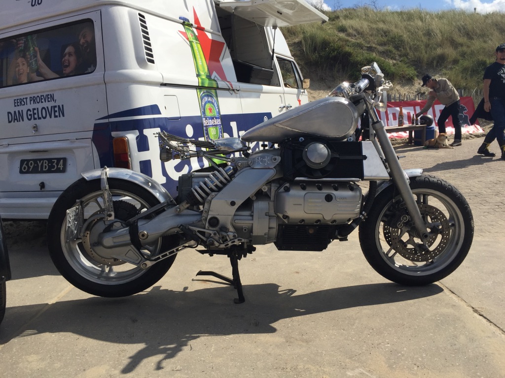 Dhr. Tamura heeft het design gemaakt, wij hebben de technische uitvoering gedaan. Gezorgd dat de motor goed functioneert en heerlijk rijdt! Echt een heel bruut beest met veel specifieke one-off onderdelen, waaronder een handgeklopte aluminium benzine tank.